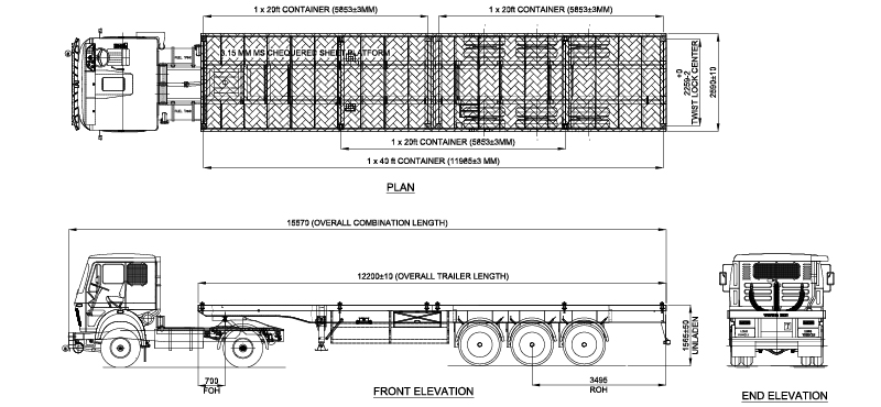 All steel welded construction. 2 Nos Main longitudinal members are of high strength lighter weight Parallel flange Beam running along full length of the trailer. Cross members - Rolled or Folded of material IS-2062 are positioned at suitable locations. 3.15 MS chequered sheet platform. 12 no’s of twist lock shall be provided to suit 1- 40 feet or 2 – 20 feet or 1-20 feet ISO container at middle.