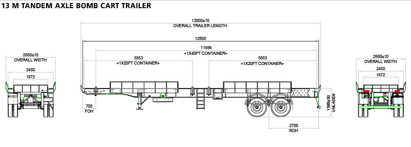 | CHASSIS | All steel welded construction. 2 Nos Main longitudinal members are high strength lighter weight Parallel flange Beam of IS2062 (or) Equivalent grade steel running along full length of the trailer. Cross members - Rolled or Folded of material IS-2062/ST-52 are positioned at suitable locations.6 Nos of shock absorber springs provided for 20 ft and 40 ft container. |