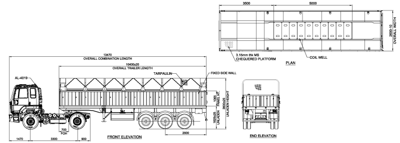 All steel welded construction. 2 Nos Main longitudinal members are high strength lighter weight Parallel flange Beam of ST 52 (or) Equivalent grade steel running along full length of the trailer. Cross members - Rolled or Folded of material IS-2062/ST-52 are positioned at suitable locations. 3.15 MS chequered sheet platform. Fixed front & sides, drop down rear doors shall be provided as shown in G.A drg. 5m coil well shall be provided. Collapsible canopy arrangement Tubular structure with Roller for ease of sliding, shall be provided. Structure shall be covered by Tarpaulin for weather resistance. Rear tarpaulin shall be provided with roll up arrangement.
